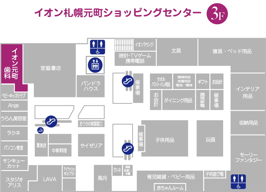 当院はイオン札幌元町ショッピングセンターの3階にある歯科医院です。一般歯科、小児歯科、口腔外科等、地域の歯の相談窓口をモットーに、患者様のお悩みを丁寧にお聞きし、一人ひとりに合った治療プランをご提案いたします。土日祝も診察しておりますのでいつでもお気軽にご相談ください。